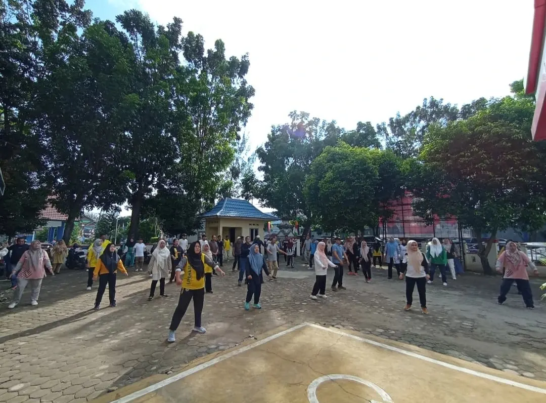 Senam sehat dipandu oleh instruktur profesional, sehingga suasana berlangsung meriah dan penuh semangat. Para peserta tampak bersemangat mengikuti setiap gerakan senam, diiringi musik yang menambah keceriaan suasana pagi.